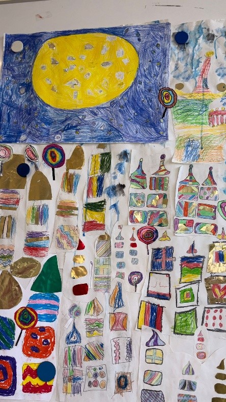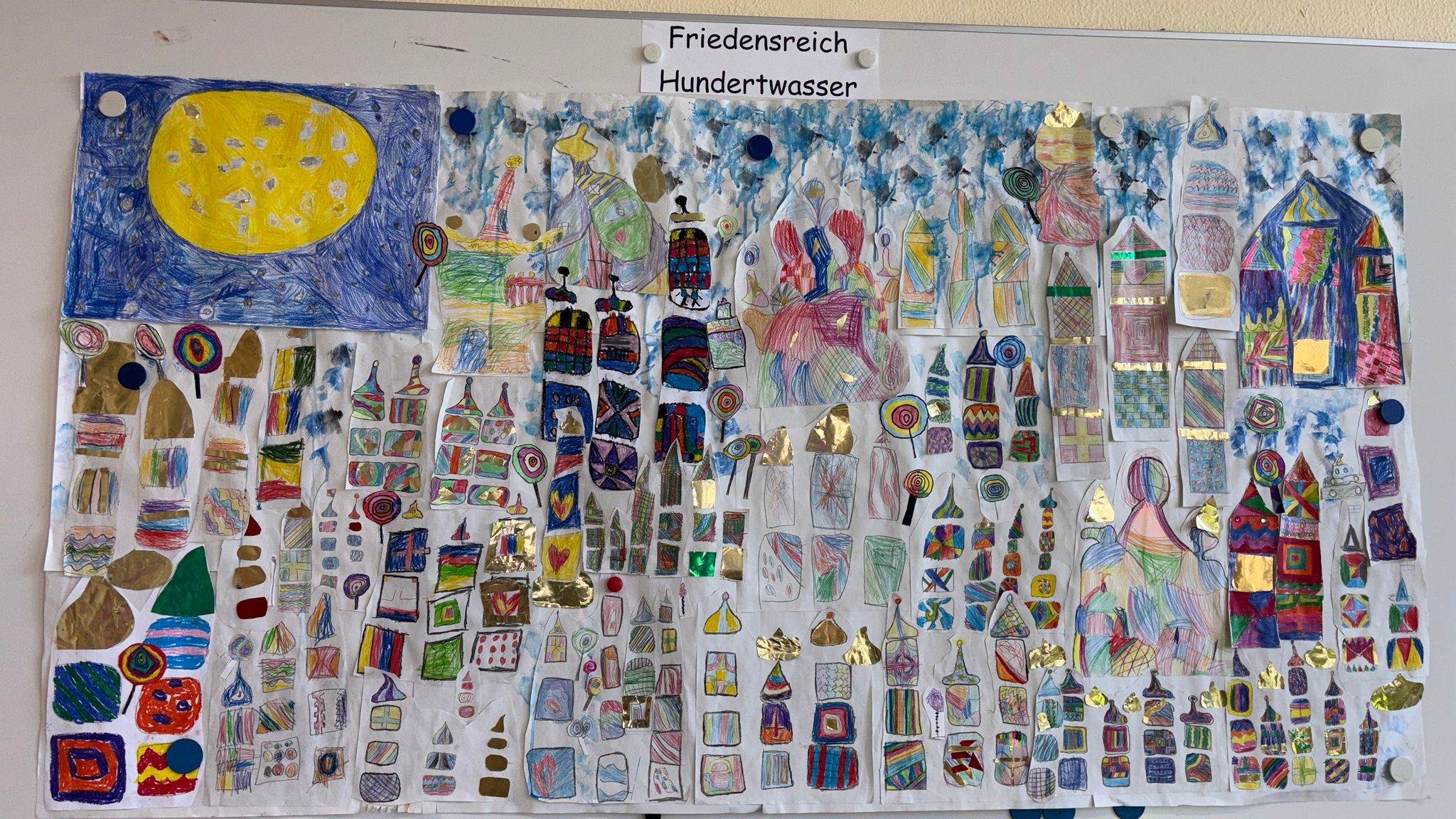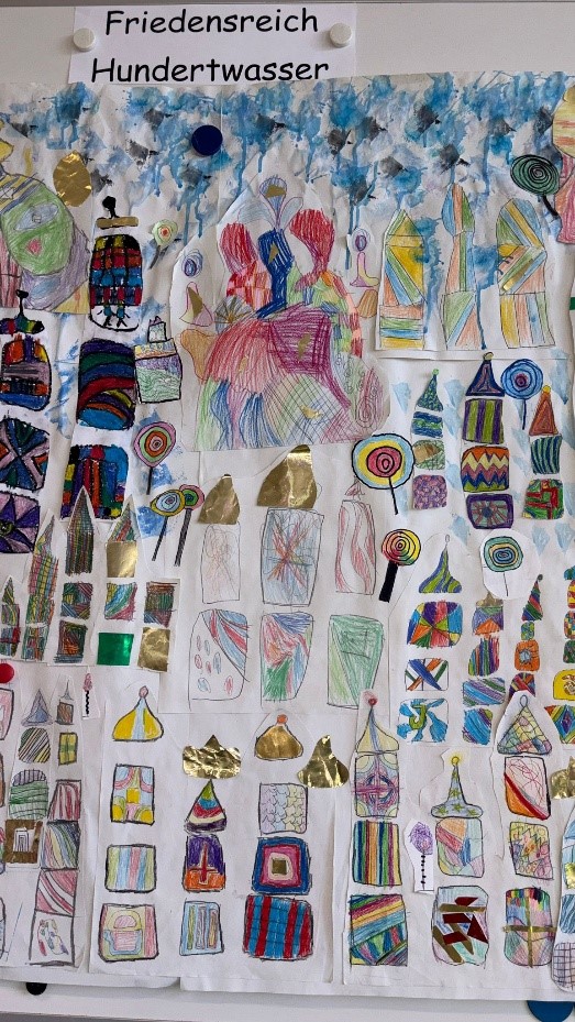 Die Bärenklasse 2a hat sich auf die Spuren von Friedensreich Hundertwasser begeben. Herausgekommen ist ein Gemeinschaftsbild mit farbenfrohen Häusern.