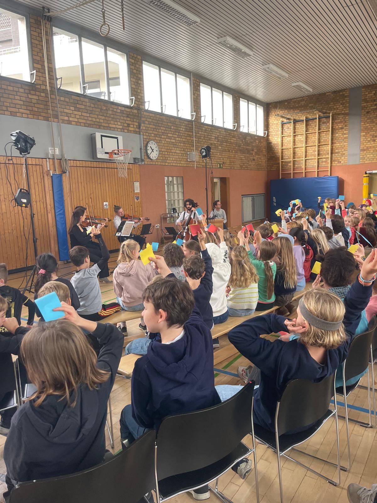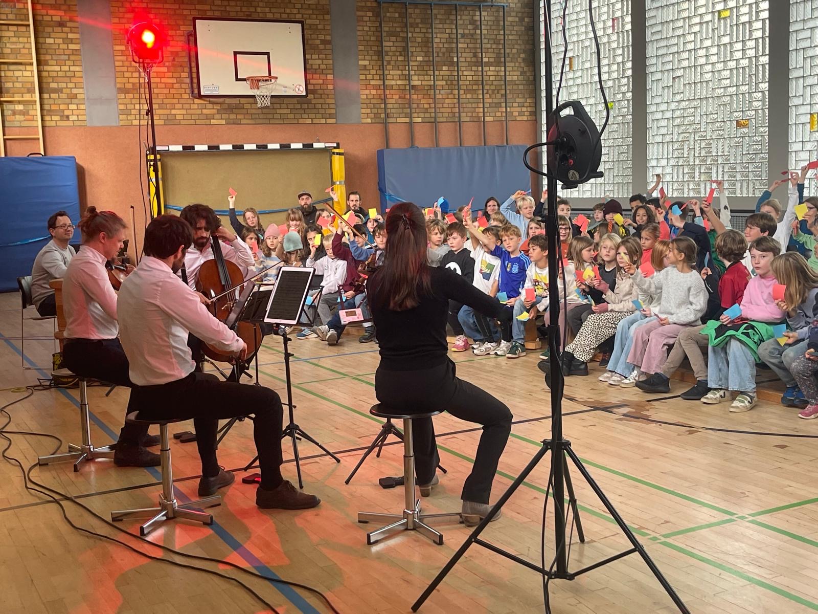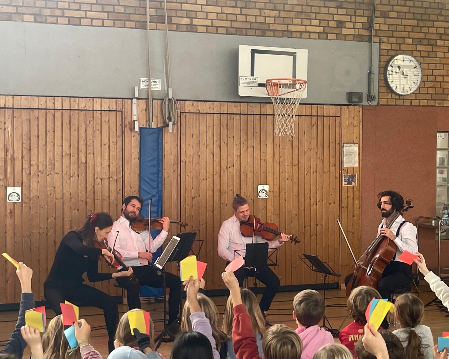 Das „Musikalische Kaleidoskop 2025“ ist ein Projekt, das Kinder für klassische Musik begeistern möchte. Am 04.11. war das renommierte „ALINDE QUARTETT“ zu Gast bei uns an der Schule. Die vier Musiker:innen spielten ein wunderbares Konzert für die Kinder aus den Stufen 3 und 4, die herzlich dazu eingeladen waren, während der Live-Musik mit mitgebrachten Farbkarten ihre eigenen Emotionen zur Musik zum Ausdruck zu bringen. So gestalteten die Kinder die visuelle Atmosphäre der Musik und das Konzert wurde interaktiv.