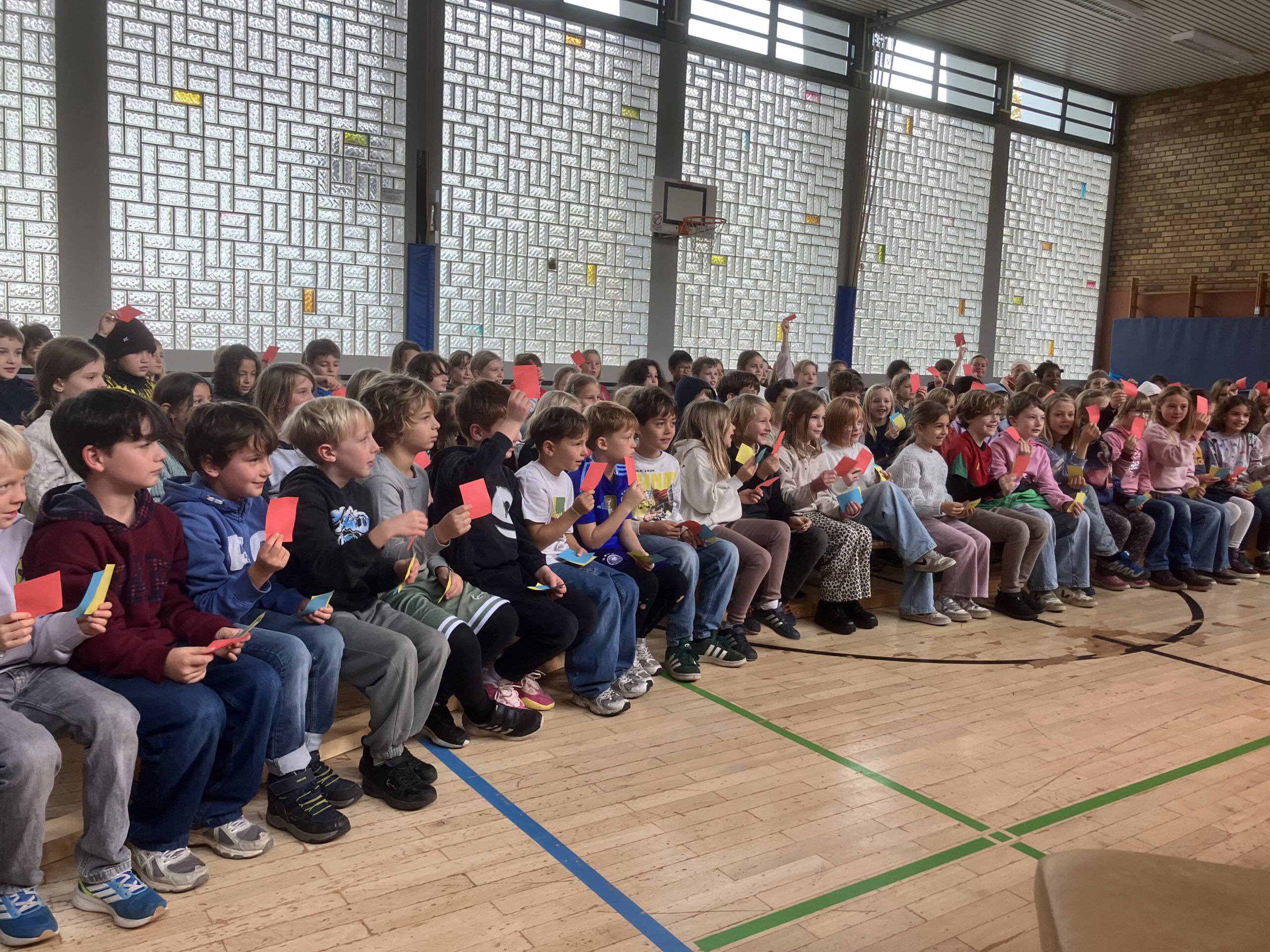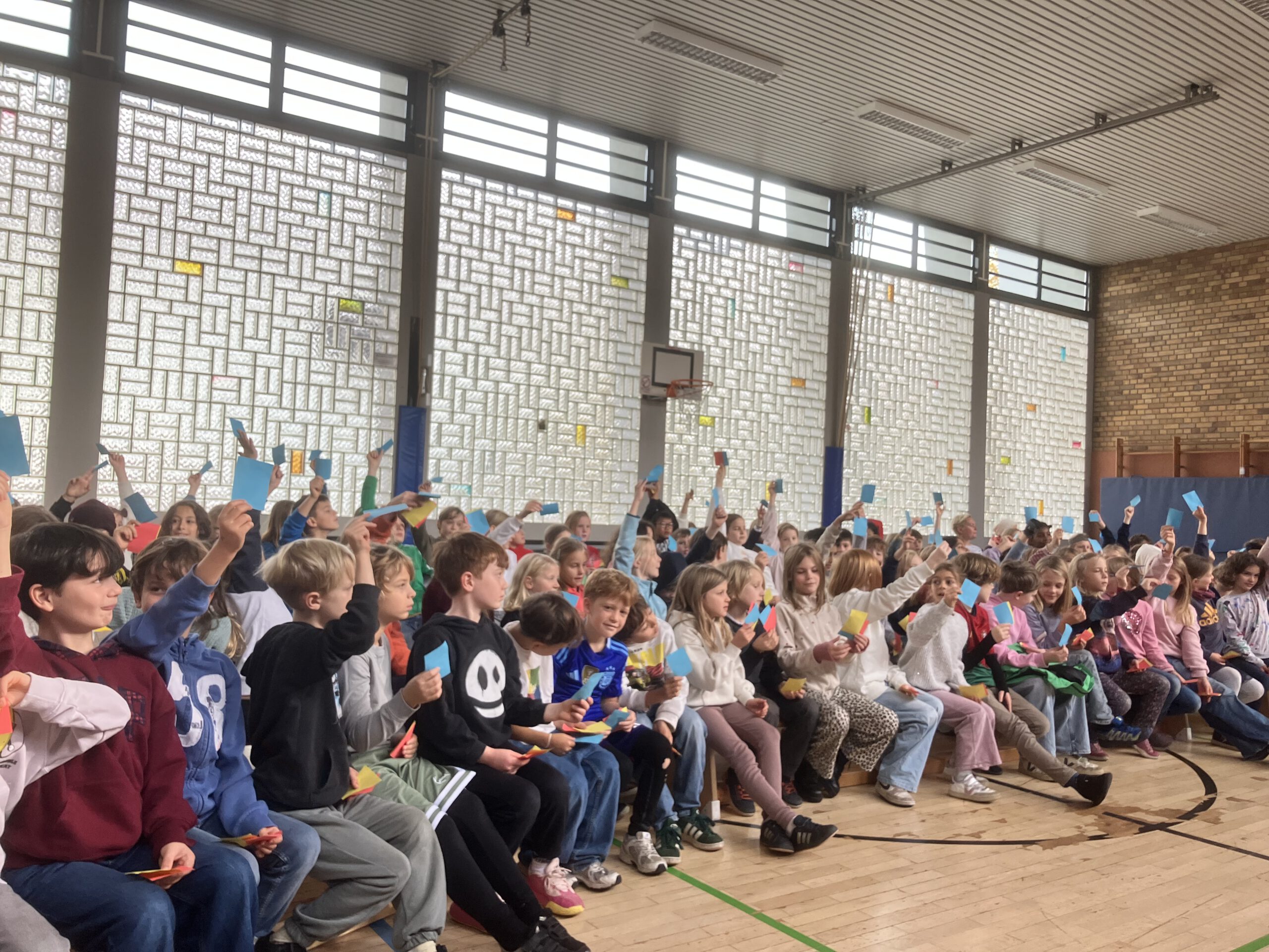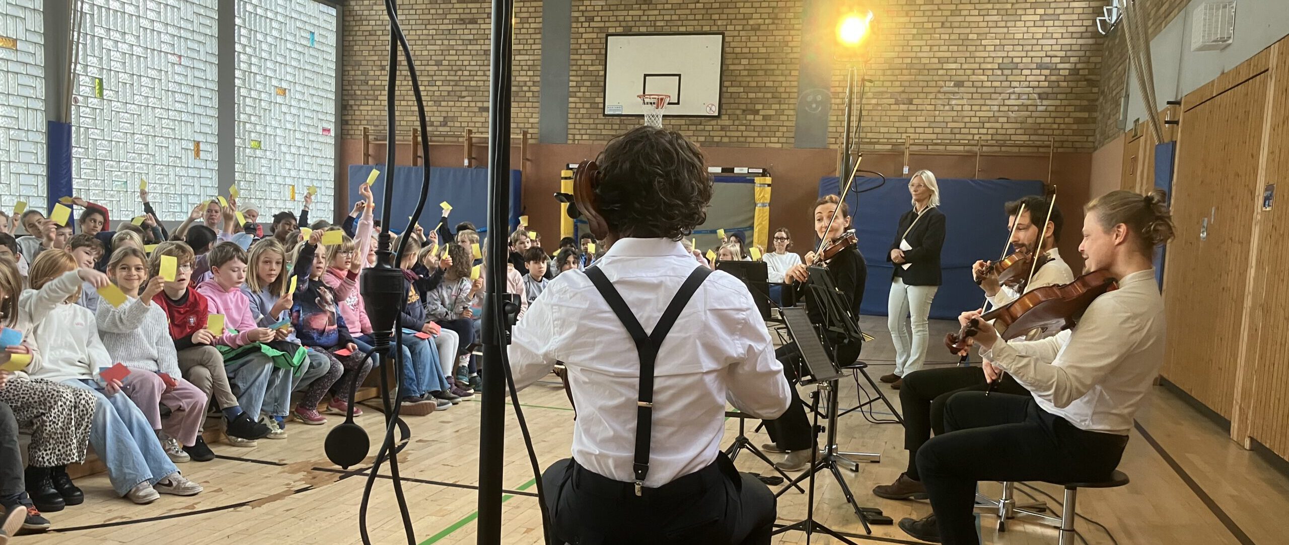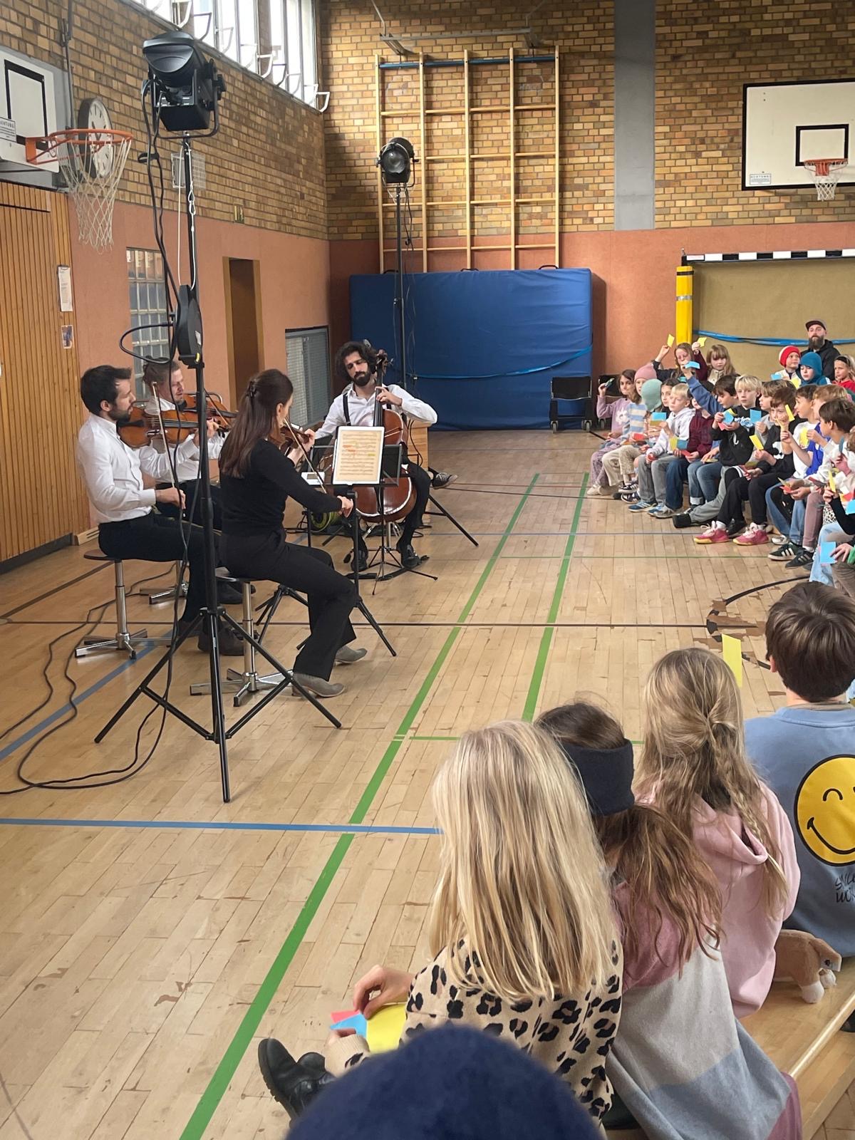 Das „Musikalische Kaleidoskop 2025“ ist ein Projekt, das Kinder für klassische Musik begeistern möchte. Am 04.11. war das renommierte „ALINDE QUARTETT“ zu Gast bei uns an der Schule. Die vier Musiker:innen spielten ein wunderbares Konzert für die Kinder aus den Stufen 3 und 4, die herzlich dazu eingeladen waren, während der Live-Musik mit mitgebrachten Farbkarten ihre eigenen Emotionen zur Musik zum Ausdruck zu bringen. So gestalteten die Kinder die visuelle Atmosphäre der Musik und das Konzert wurde interaktiv.