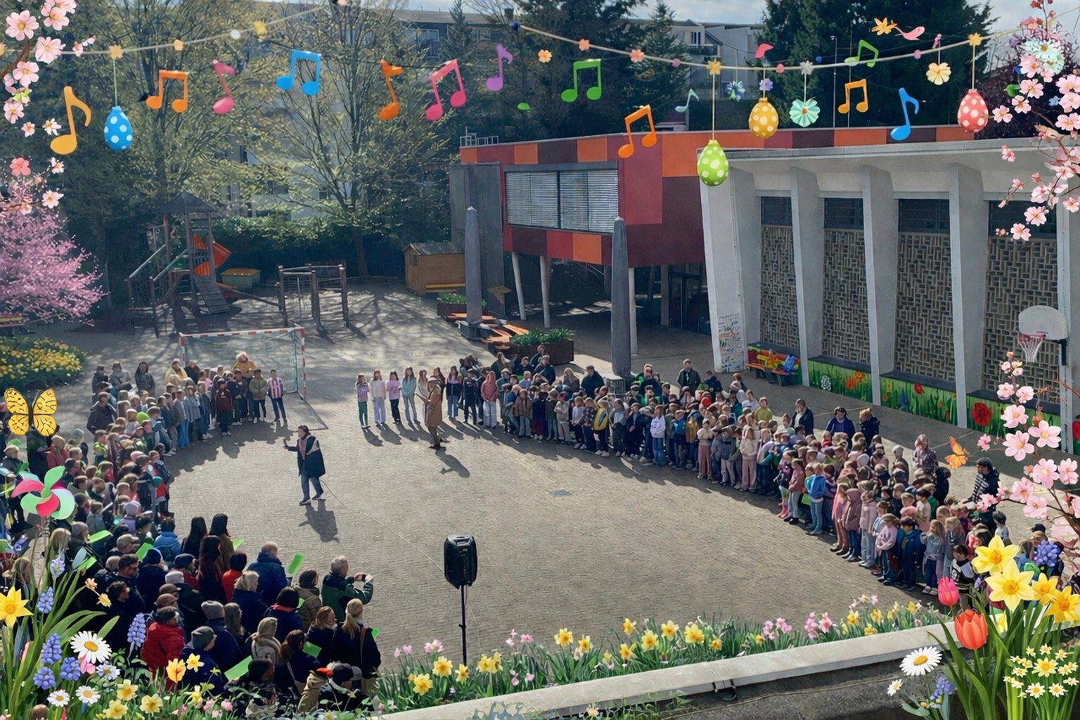 Am letzten Schultag vor den Osterferien fand bei schönem Sonnenschein unser traditionelles Frühlingssingen auf dem Schulhof statt. Die Kinder sangen gemeinsam die Frühlingslieder, die alle Klassen zuvor im Musikunterricht eingeübt hatten. Toll, dass so viele Eltern dabei waren, die uns kräftig beim Singen unterstützt haben! „Ich lieb´ den Frühling, ich lieb´ den Sonnenschein…“ :-)